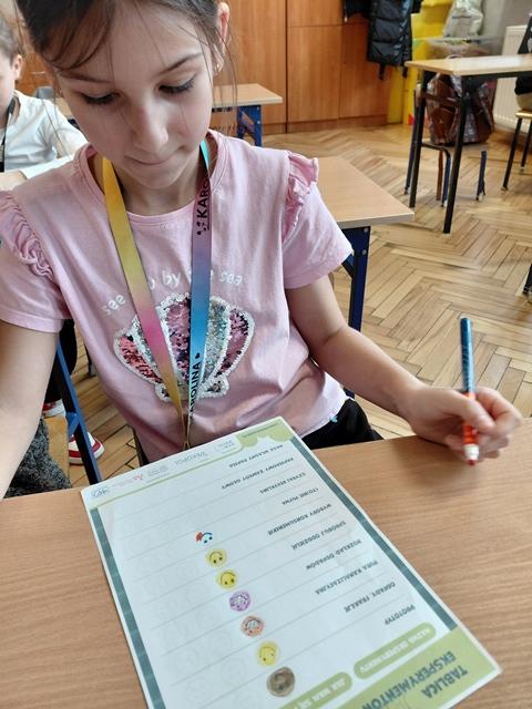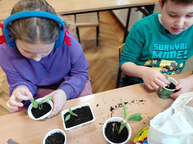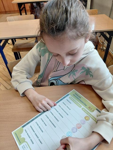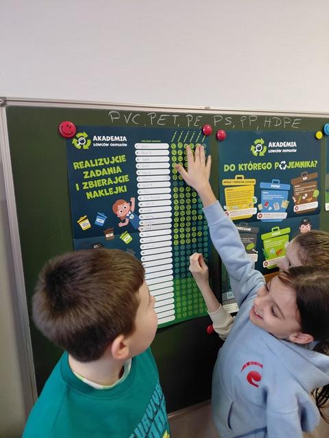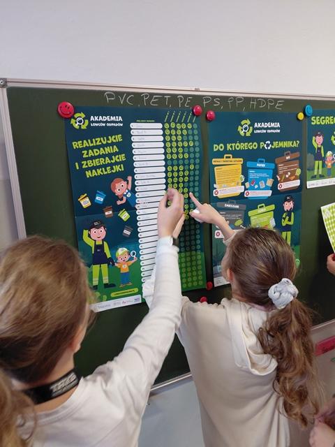 Następnie rozwiązały zadania z kart pracy i utrwaliły zasadę 3R. Zgodnie z drugą zasadą R, zamieniły plastikowe pojemniczki po jogurtach na małe doniczki. Na koniec oceniły eksperymenty i wkleiły jedną naklejkę na plakacie Łowców!