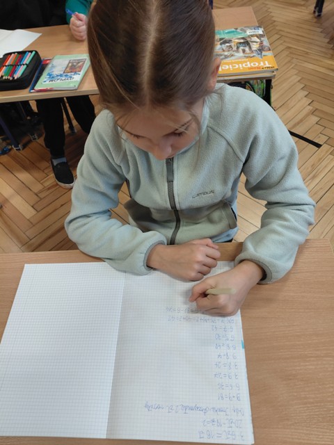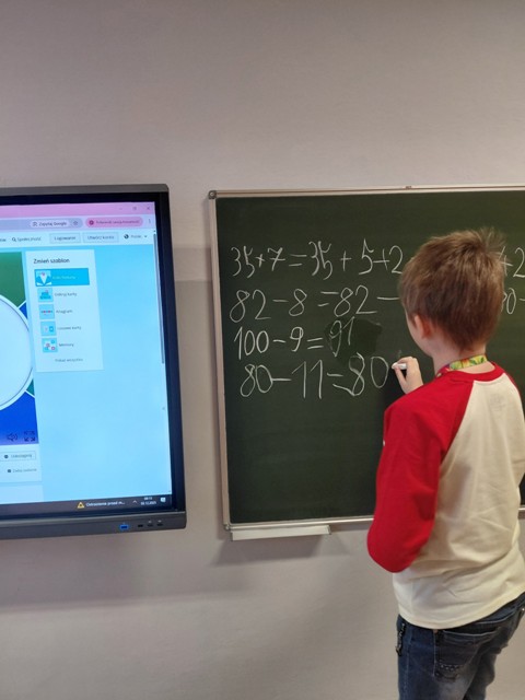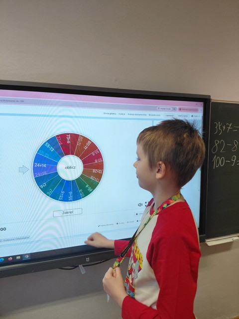 Podczas zajęć ćwiczyliśmy dodawanie i odejmowanie liczb dwucyfrowych losując zadania na kole fortuny.