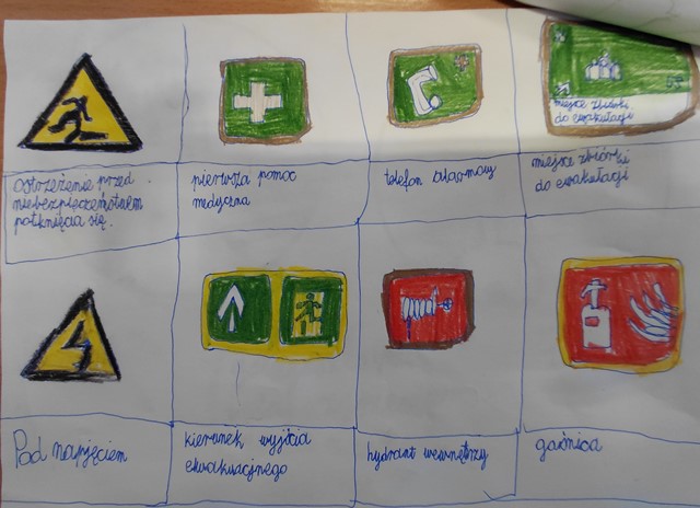 Przypomnieliśmy sobie znaki mówiące o zasadach bezpieczeństwa w szkole w czasie zagrożenia. Wiemy, jak zachowywać się, żebyśmy bezpiecznie poruszali się po naszej szkole w razie potrzeby.
