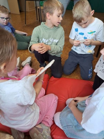 A na koniec, dzieci odpoczywały słuchając bajki "Kolorowe kredki" w formie teatru kamishibai.