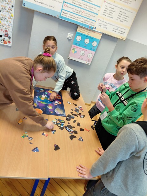 Przypominając wiadomości o sylabach, głoskach i literach układaliśmy planszę magnetyczną "w kosmosie". Nasze wypowiedzi na temat planet, satelit, kosmonautów oraz całego kosmosu były bardzo ciekawe.