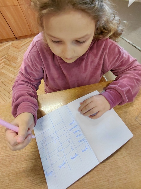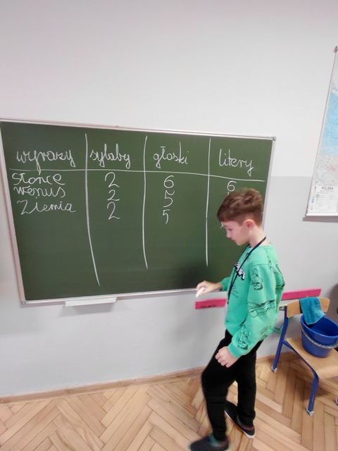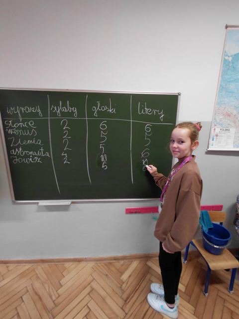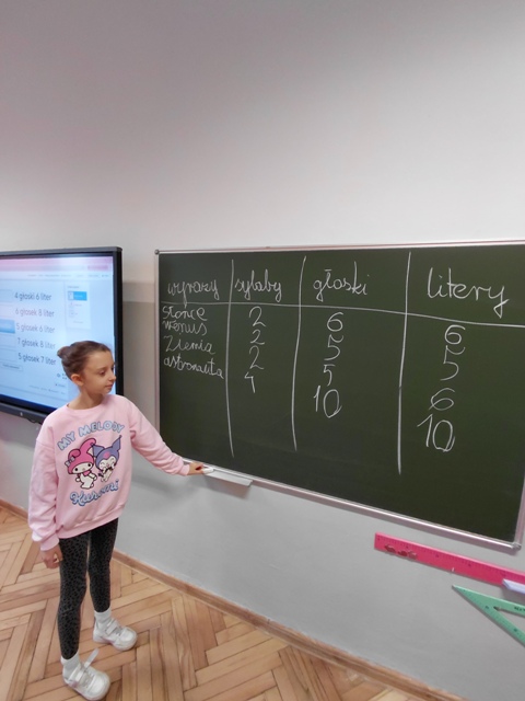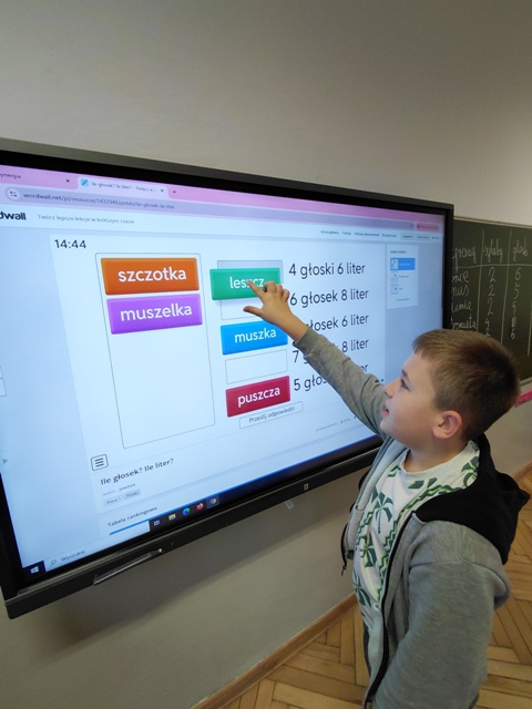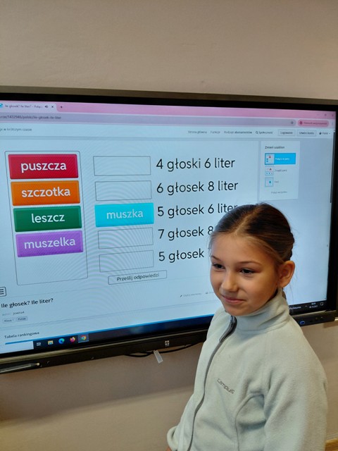 Następnie, wybierając wyrazy z naszej planszy zapisywaliśmy je w zeszytach i obliczaliśmy liczbę sylab, głosek i liter. Po ćwiczeniach w zeszycie sprawdziliśmy nasze wiadomości w programie Wordwall.