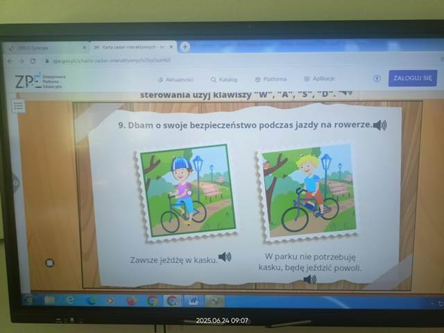 W ramach realizacji projektu Tydzień dla Bezpieczeństwa klasa 1a zajęła się dzisiaj zagadnieniami związanymi z bezpieczeństwem w domu, szkole i na ulicy oraz z bezpieczeństwem podczas jazdy rowerem.
