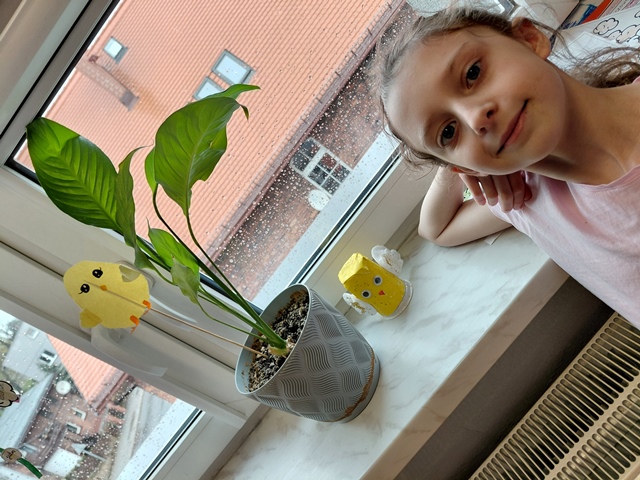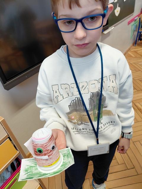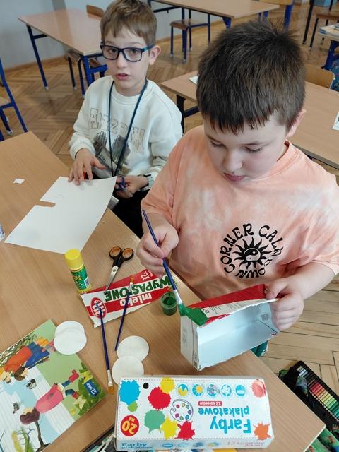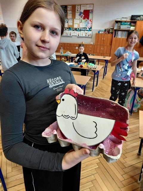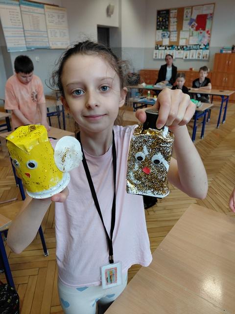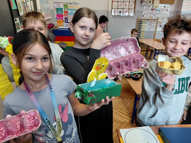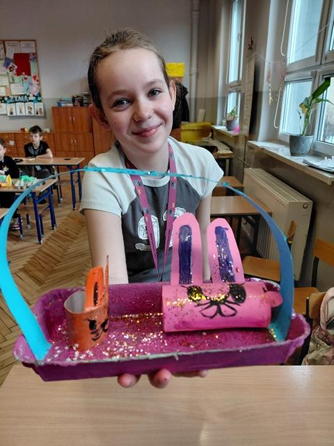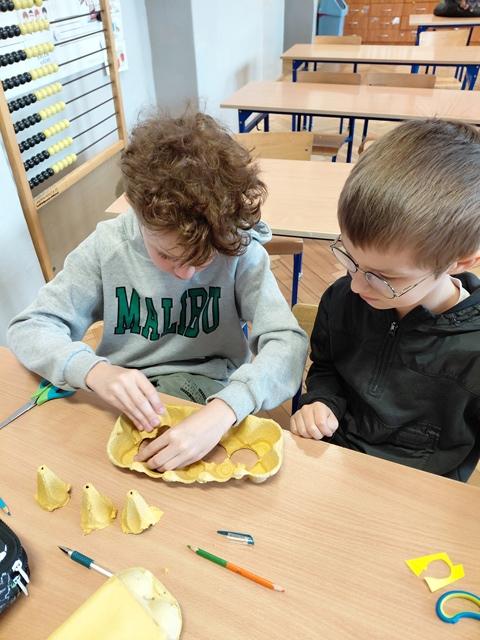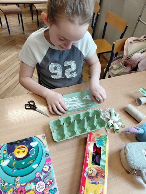 Następnie rozwiązały zadania z kart pracy. Eksperymentując, zamieniły papierowe odpady na ozdoby świąteczne. Powstały kurczaczki, zajączki, koszyczki i inne.